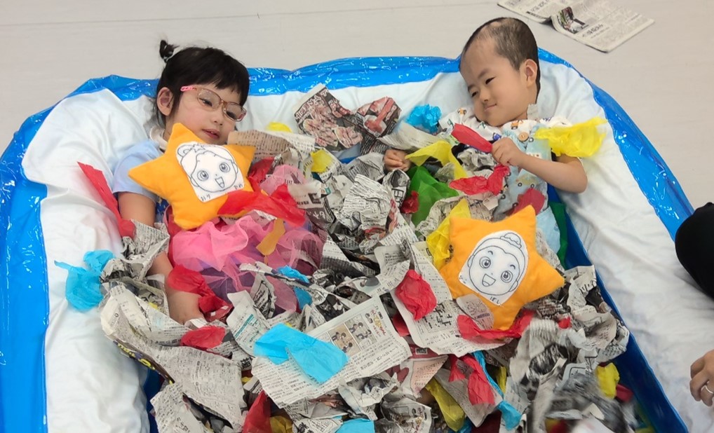 紙遊びでは、紙をたくさんちぎって、天の川プールを作って遊びました。